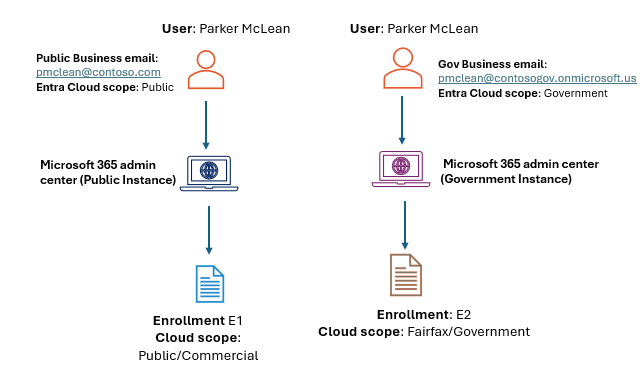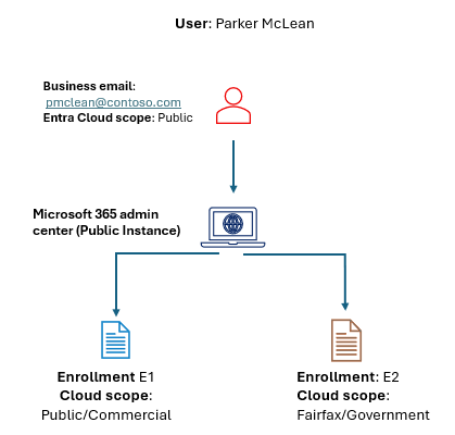 Beispielsweise kann sich der Benutzer Parker McLean heute mit seiner Entra-ID in der öffentlichen Cloud bei der Microsoft 365 Admin Center anmelden und auf seine öffentlichen und behördlichen Registrierungen zugreifen, wie im folgenden Diagramm dargestellt: