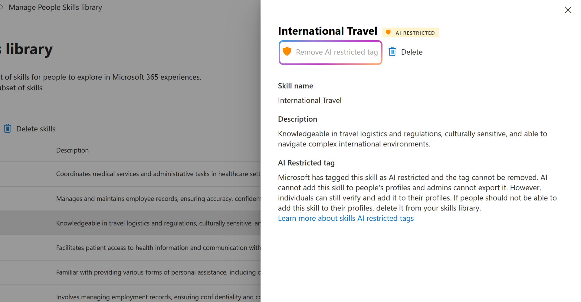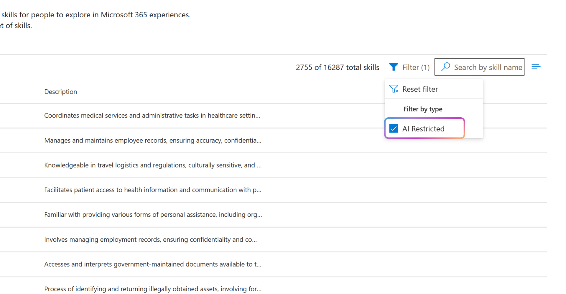 Administratoren können bestimmte Fähigkeiten als KI-eingeschränkt kennzeichnen, z. B. die Fähigkeiten, die als vertraulich oder vertraulich betrachtet werden können. Diese Fähigkeiten können sich auf bestimmte Projekte, proprietäre Technologien oder andere Bereiche beziehen, die ein organization möglicherweise von der Verwendung in KI-basierten Qualifikationsrückschlüssen ausschließen möchte.
