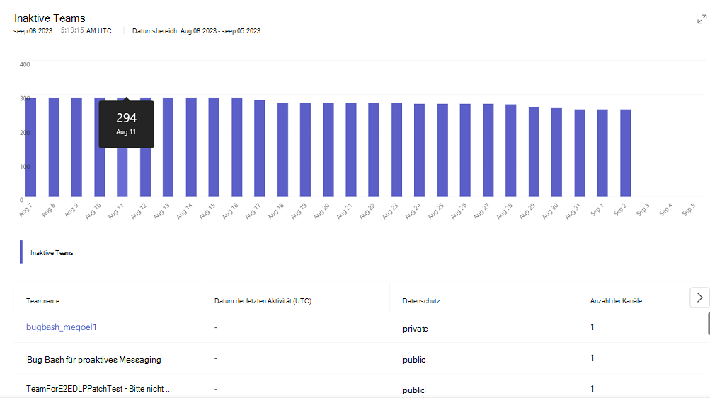 Das Balkendiagramm oben zeigt die tägliche Anzahl inaktiver Teams, wobei jeder Balken die Anzahl der Teams darstellt, die an diesem bestimmten Tag als inaktiv betrachtet werden. Die folgende Tabelle zeigt den ausgewählten Zeitraum (30 oder 60 Tage) und listet die Teams auf, die während der gesamten ausgewählten Dauer inaktiv waren.