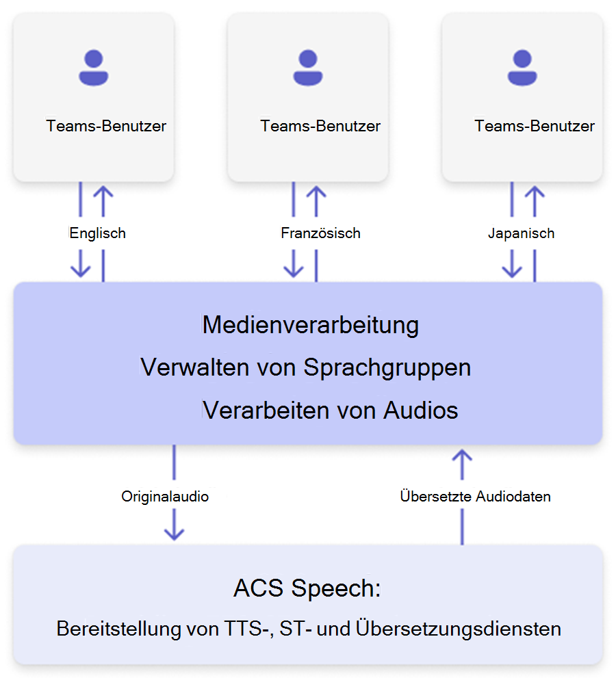 Interpreter führt sts-Übersetzungen (Speech-to-Speech) in Echtzeit mithilfe von Azure Cognitive Services durch und unterstützt unterhaltungen mit mehreren Sprechern in gemischten Sprachen in Teams-Besprechungen. So funktioniert das: