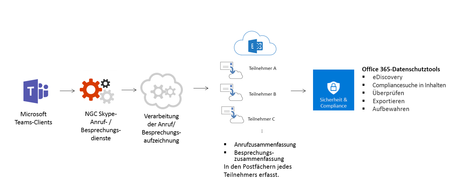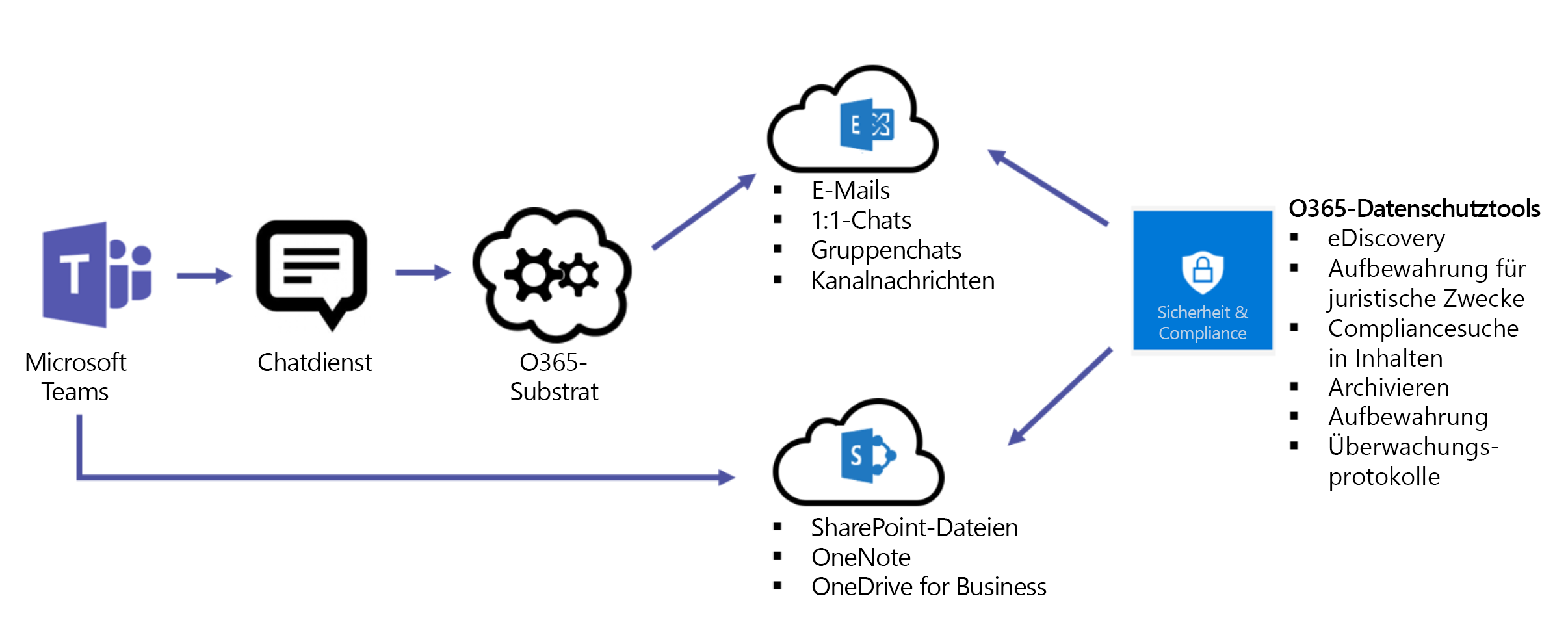 Die folgende Abbildung zeigt den Ablauf der Erfassung von Microsoft Teams-Daten (Microsoft Teams-Dateien und -Nachrichten) in Exchange und SharePoint.
