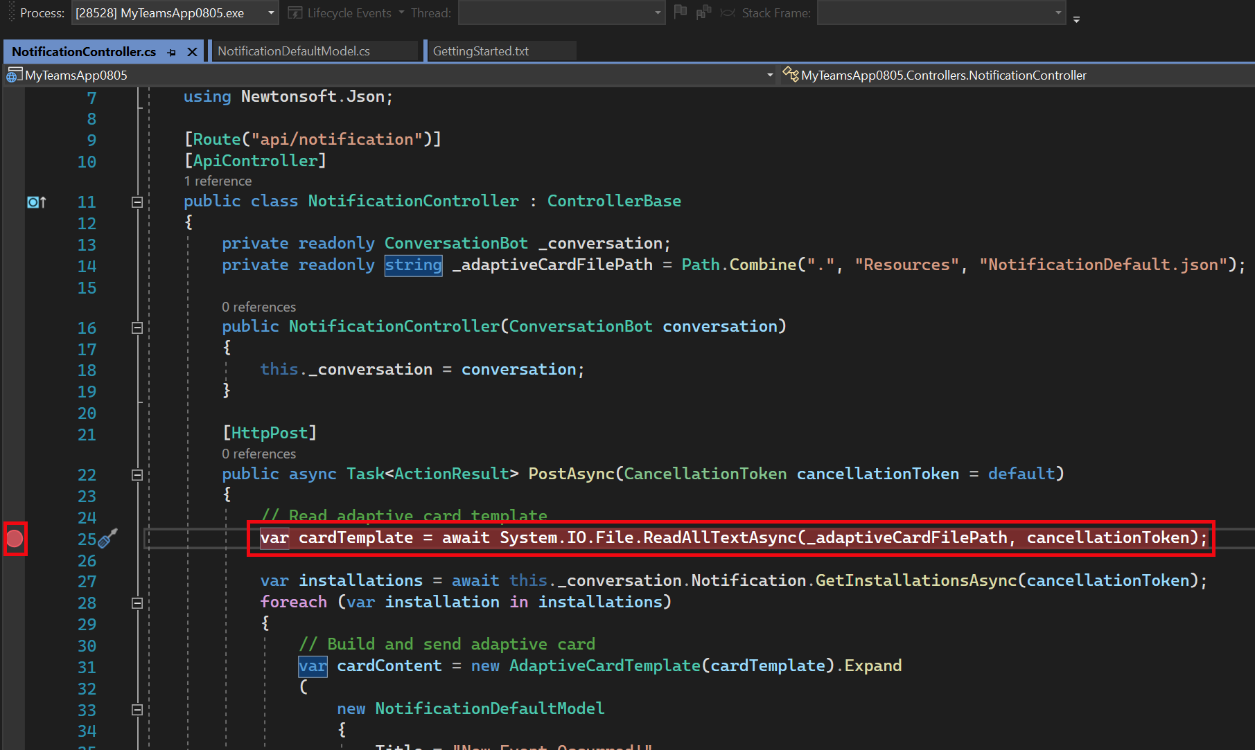 Breakpoints umschalten: Umschalten von Haltepunkten im Quellcode von Registerkarten, Bots, Nachrichtenerweiterungen und Azure Functions. Die Haltepunkte werden ausgeführt, wenn Sie mit der Teams-App in Ihrem Webbrowser interagieren.