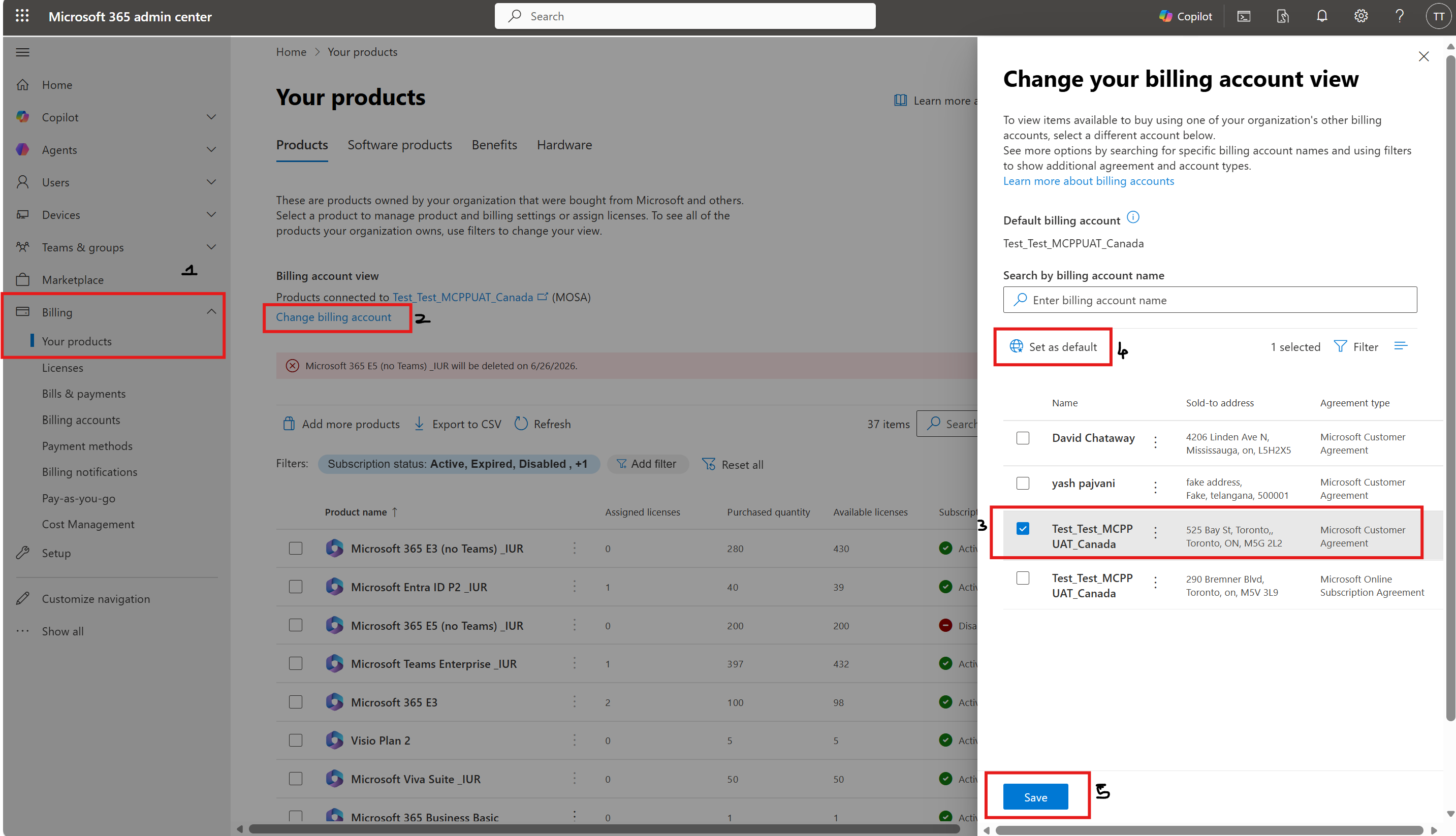Wenn Sie über mehrere Abrechnungskonten verfügen, können beide Probleme auftreten, wenn das Standardabrechnungskonto im Admin Center nicht das gleiche MCA-Abrechnungskonto ist, das zum Kauf des Angebots verwendet wurde.