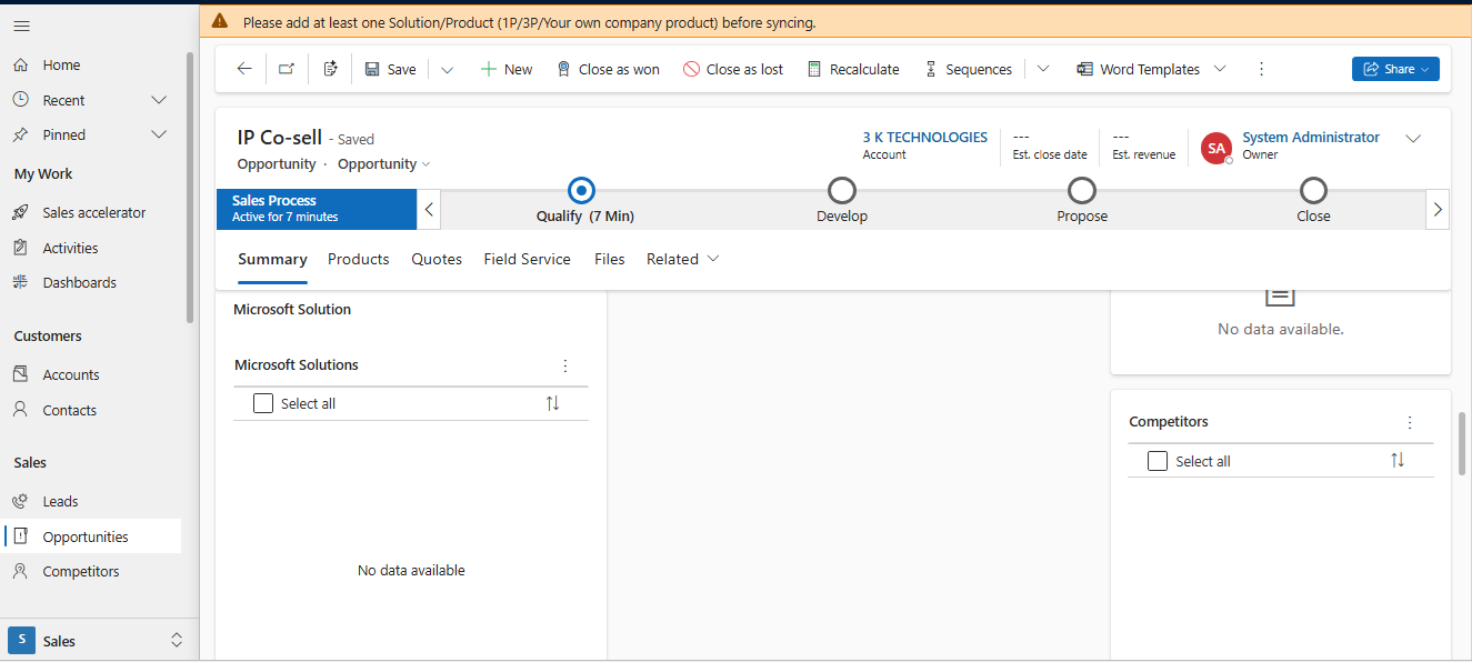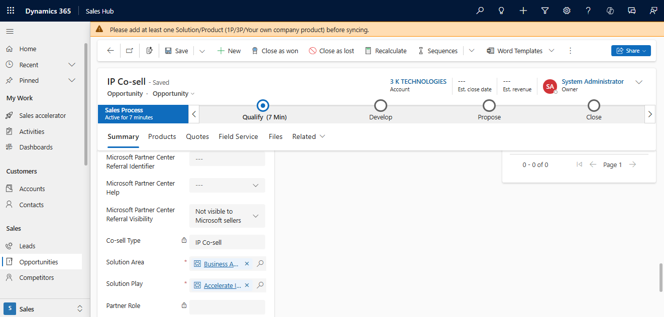 - Für Den Co-Sell-Typ: IP Co-Sell, Solution Area und Solution Play sind obligatorisch, und die Partnerrolle ist deaktiviert. Das Synchronisierungsfeld wird nur aktiviert, wenn mindestens eine Lösung hinzugefügt wird. andernfalls wird eine Warnmeldung angezeigt, und das Synchronisierungsfeld wird gesperrt.