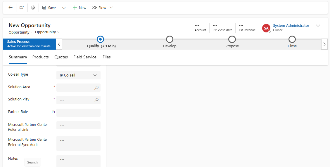 Synchronisierung mit Partner-Zentrum: Ob die Gelegenheit mit dem Partner-Zentrum synchronisiert werden soll. Standardmäßig ist der Wert dieses Feldes No und muss explizit aktiviert werden Ja durch Ihren Verkäufer, um eine Gelegenheit mit Microsoft zu teilen. Neue Überweisungen, die vom Partner-Zentrum an CRM weitergegeben werden, haben diesen Feldwert aktiviert Ja. Wenn für den Co-Sell-Typ 'IP Co-Sell' keine Lösung zur Gelegenheit hinzugefügt wurde, ist dieses Sync-Feld gesperrt. Sie müssen mindestens eine Lösung hinzufügen, um dieses Feld auf "Ja" festzulegen.