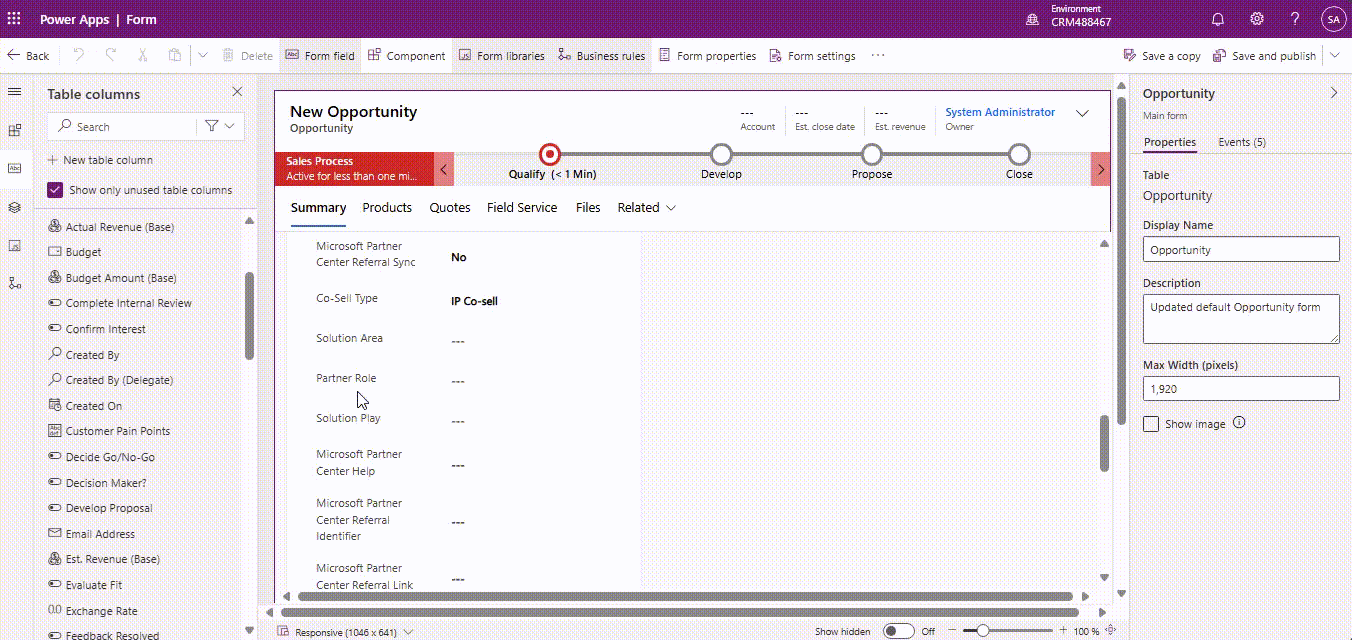 Gelegenheit-Felder: Wenn es Pflichtfelder gibt in Gelegenheit die aufgefüllt werden müssen, bearbeiten [Anpassen] Erstellen oder Abrufen von Details aus dem Dynamics 365-Ablauf und go to Create or update opportunity im CRM und aktualisieren Erstellen Sie eine neue Gelegenheit Aktion um den Pflichtfeldern auf der Grundlage Ihrer Geschäftsanforderungen Werte zuzuweisen.