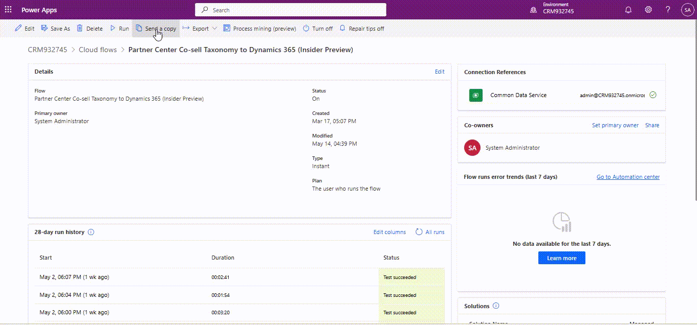 Wenn neue Taxonomiewerte hinzugefügt werden oder vorhandene Werte im Partner Center für Lösungsbereich, Lösungsspiel und Partnerrolle aktualisiert werden, müssen Sie denselben Fluss manuell ausführen: Partner Center Co-sell Taxonomie an Dynamics 365 (Insider Preview). Dadurch wird sichergestellt, dass die neu hinzugefügten oder aktualisierten Taxonomiewerte ordnungsgemäß mit dem CRM synchronisiert werden.
