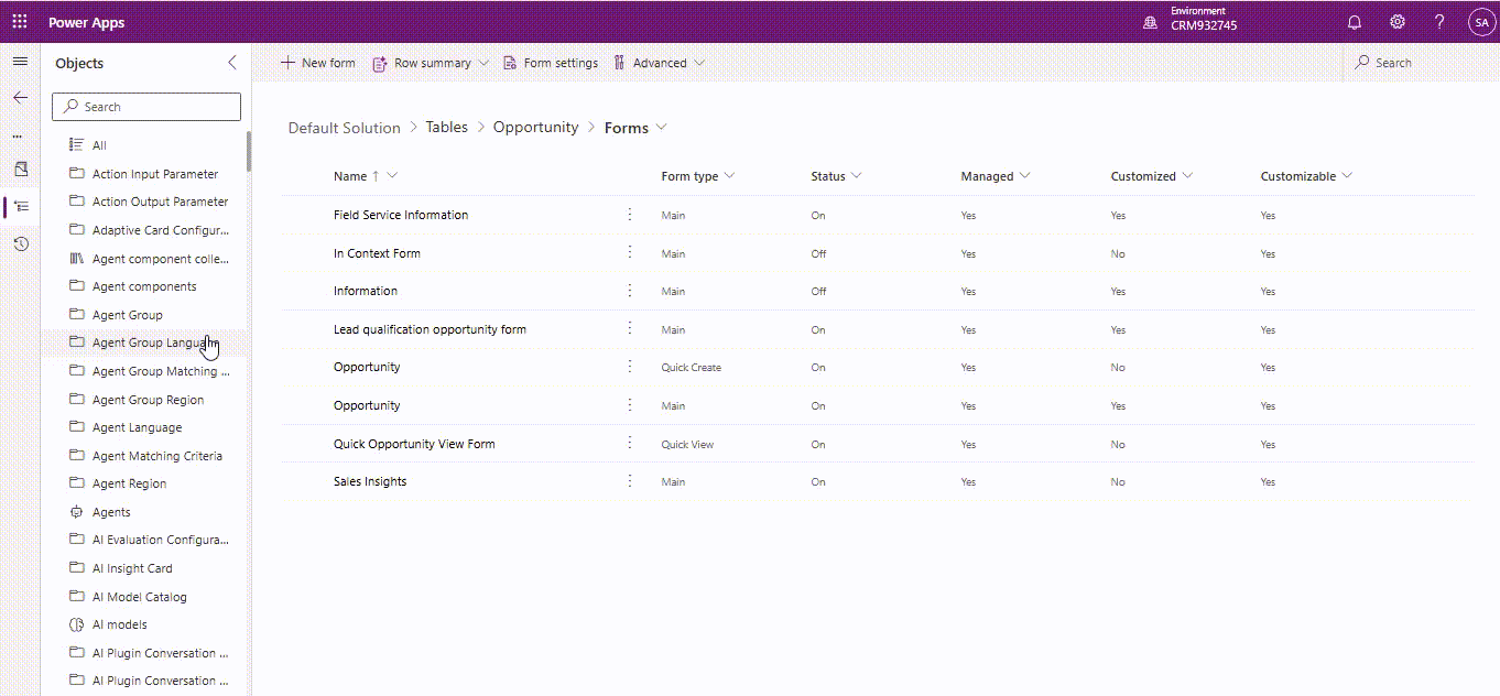 - Gehen Sie zur Standardlösung und suchen Sie nach der Gelegenheit-Tabelle.