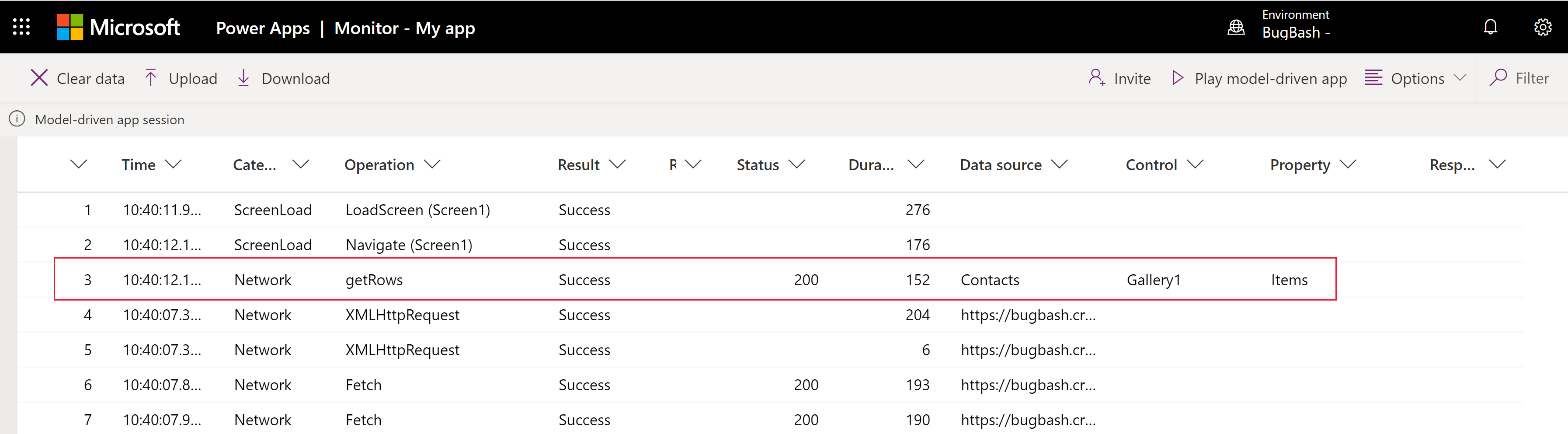 Wenn Sie in Live-Monitor nach benutzerdefinierten seitenbezogenen Ereignissen der modellgesteuerten App filtern, können Sie während der Ausführung Ihrer App Informationen zu verknüpften Tabellen, Steuerelementen und Komponenten auf einer benutzerdefinierten Seite in Live-Monitor abrufen.