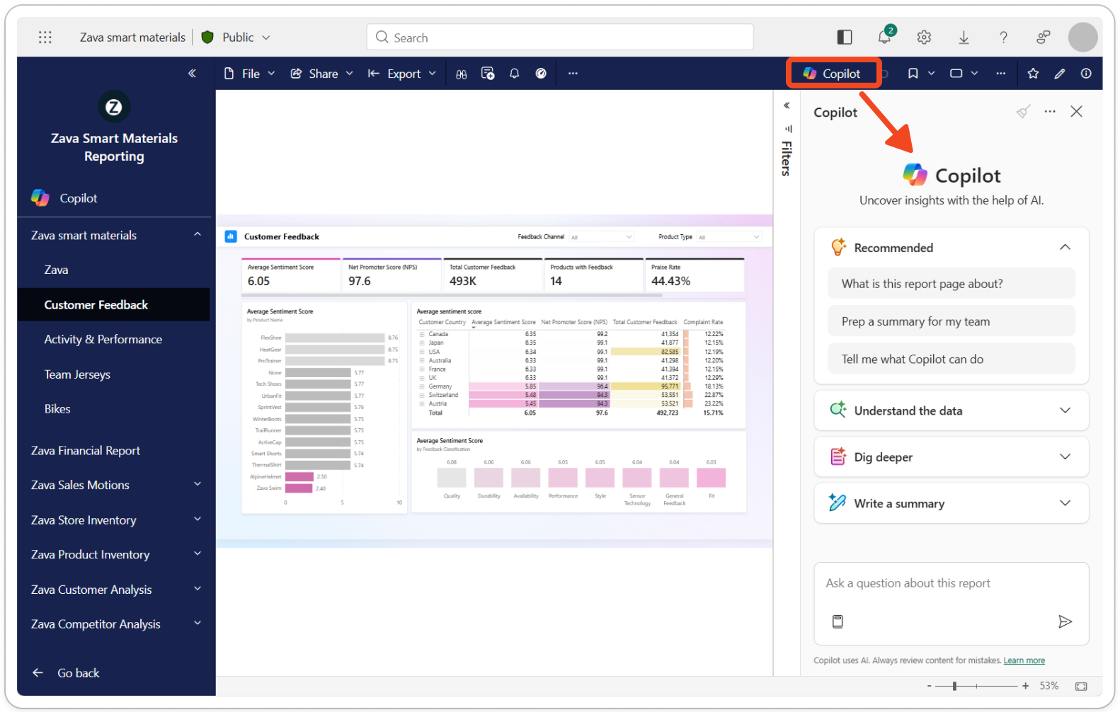 Copilot überprüft die Berichtsbeschreibungen und bietet eine aktuelle Zusammenfassung der App-Berichterstellung. Diese aktuelle Zusammenfassung hilft Ihnen, Interessantes zu finden und fokussierte Fragen zu stellen Copilot . Copilot beantwortet diese Fragen mithilfe des Kontexts, der in der Berichterstellung der App verfügbar ist.