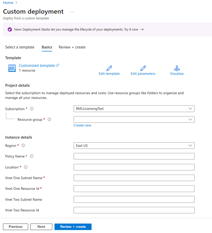 { "$schema": "https://schema.management.azure.com/schemas/2019-04-01/deploymentTemplate.json#", "contentVersion": "1.0.0.0", "parameters": { "policyName": { "type": "string", "metadata": { "description": "The name of the Enterprise Policy." } }, "powerplatformEnvironmentRegion": { "type": "string", "metadata": { "description": "Geography of the PowerPlatform environment." } }, "vNetOneSubnetName": { "type": "string" }, "vNetOneResourceId": { "type": "string", "metadata": { "description": "Fully qualified name, such as /subscription/{subscriptionid}/..." } }, "vNetTwoSubnetName": { "defaultValue": "", "type": "string" }, "vNetTwoResourceId": { "defaultValue": "", "type": "string", "metadata": { "description": "Fully qualified name, such as /subscription/{subscriptionid}/..." } } }, "variables": { "vNetOne": { "id": "[parameters('vNetOneResourceId')]", "subnet": { "name": "[parameters('vNetOneSubnetName')]" } }, "vNetTwo": { "id": "[parameters('vNetTwoResourceId')]", "subnet": { "name": "[parameters('vNetTwoSubnetName')]" } }, "vNetTwoSupplied": "[and(not(empty(parameters('vNetTwoSubnetName'))), not(empty(parameters('vNetTwoResourceId'))))]" }, "resources": [ { "type": "Microsoft.PowerPlatform/enterprisePolicies", "apiVersion": "2020-10-30-preview", "name": "[parameters('policyName')]", "location": "[parameters('powerplatformEnvironmentRegion')]", "kind": "NetworkInjection", "properties": { "networkInjection": { "virtualNetworks": "[if(variables('vNetTwoSupplied'), concat(array(variables('vNetOne')), array(variables('vNetTwo'))), array(variables('vNetOne')))]" } } } ] }Speichern Sie die Vorlage, und geben Sie die Details ein, um die Unternehmensrichtlinie zu erstellen, die die folgenden Informationen enthält: