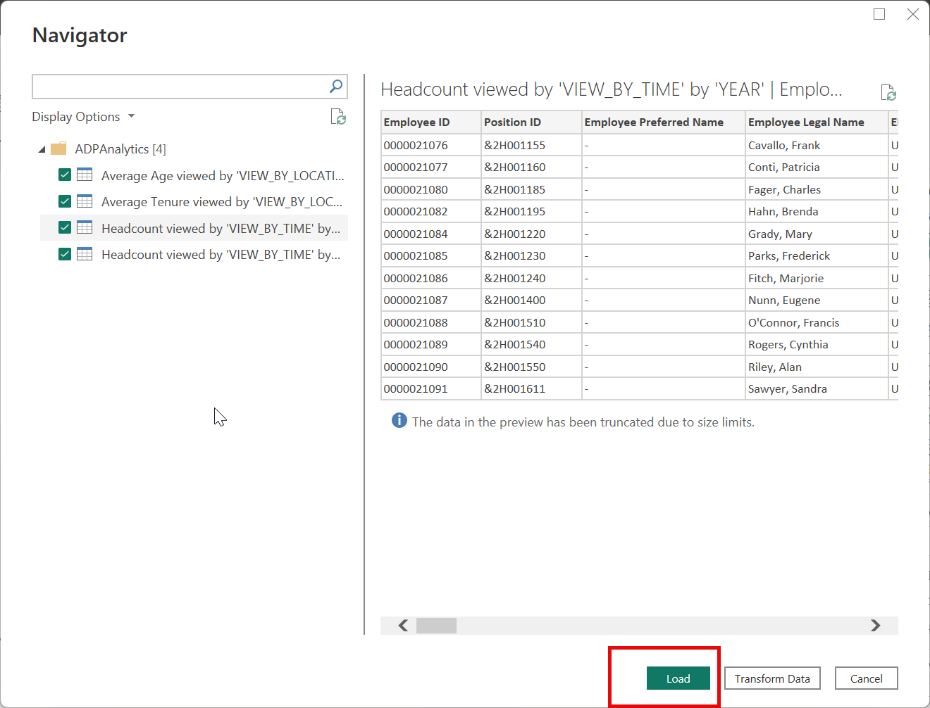 - ADP Analytics verfügt über eine integrierte Grenze von 25 Metriken, die in Power BI in einer einzigen Verbindung importiert werden können.