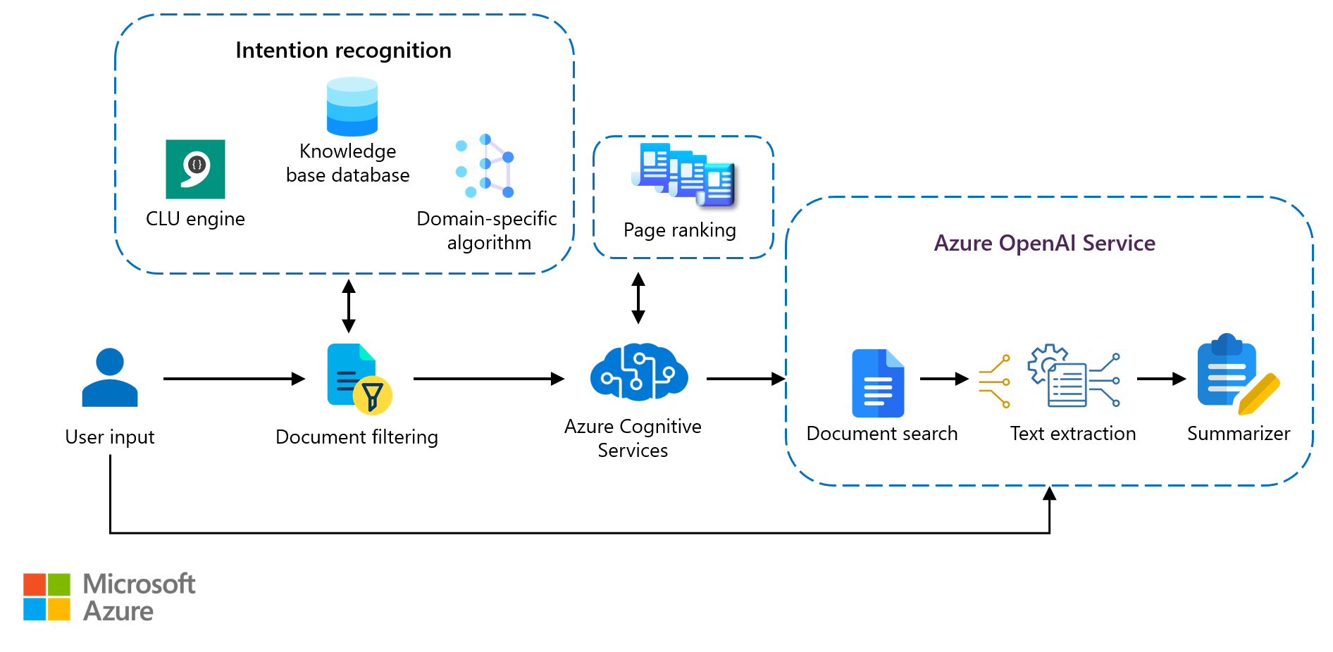 - A user sends a query. For example, an employee of a manufacturing company searches for specific information about a machine part on the company portal. The query is first processed by an intent recognizer like Conversational language understanding. The relevant entities or concepts in the user query are used to select and present a subset of documents from a knowledge base that's populated offline (in this case, the company's knowledge base database). The output is fed into a search and analysis engine like Azure Elastic Search, which filters the relevant documents to return a document set of hundreds instead of thousands or tens of thousands.