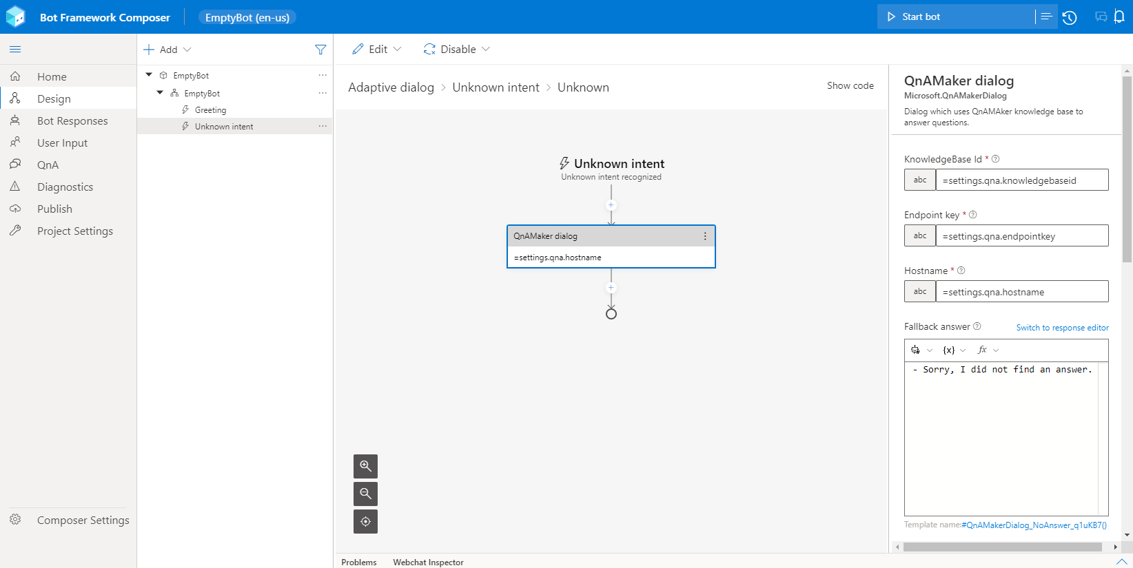 This article will show you how to add an existing QnA Maker knowledge base to your bot. Composer provides the Connect to QnA Knowledgebase action, which makes the process easy. You'll find this helpful when you want to send a user question to your bot then have the QnA Maker knowledge base provide the answer. If you want to create a QnA Maker knowledge base directly in Composer, or connect to one via QnA Maker, see the Create a QnA Maker knowledge base article.