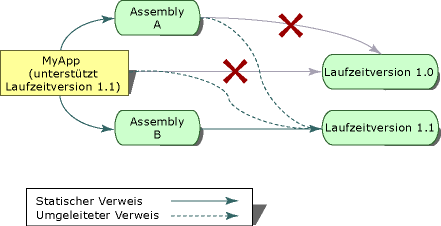 In der folgenden Abbildung verfügen MyApp und Assembly A über statische Verweise auf .NET Framework, Version 1.0, während Assembly B einen statischen Verweis auf .NET Framework, Version 1.1, aufweist. Im Beispiel wird in der Anwendungskonfigurationsdatei für MyApp angegeben, dass die Anwendung Version 1.1 unterstützt, so dass die Anwendung und Assembly A zu .NET Framework, Version 1.1, umgeleitet werden.