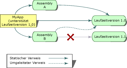 In der folgenden Abbildung verfügen MyApp und Assembly A über statische Verweise auf .NET Framework, Version 1.0, während Assembly B einen statischen Verweis auf .NET Framework, Version 1.1, aufweist. Im Beispiel wird in der Anwendungskonfigurationsdatei für MyApp angegeben, dass die Anwendung Version 1.0 unterstützt, so dass Assembly B zu .NET Framework, Version 1.0, umgeleitet wird.