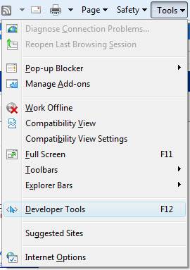 Sie können die Entwicklertools durch Drücken der F12-Taste oder durch Klicken auf die Option Entwicklertools im Menü Extras auf der Windows Internet Explorer-Symbolleiste öffnen. Abbildung 1 zeigt die Menüoption Entwicklertools, die in der rechten oberen Ecke von Windows Internet Explorer hervorgehoben ist.