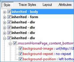 - Das Tool „Formate nachverfolgen“ zeigt die CSS-Attribute an, die auf ein Element angewendet wurden, das Element, bei dem das Attribut definiert wurde, und (falls zutreffend) den Namen des Stylesheets, von dem der Attributwert definiert wird.