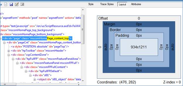 - Die Werte für „Rand", „Rahmen“ und „Abstand" zeigen die entsprechenden in der Webseite angegebenen Werte an. Wenn in der Quelle der Webseite keine Werte angegeben werden, zeigt das Layouttool die Standardwerte an, die von Windows Internet Explorer verwendet werden.
