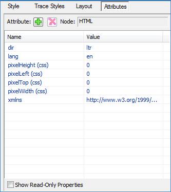 Windows Internet Explorer-Entwicklertools enthält außerdem ein Tool zur Anzeige von Attributen eines Elements. Klicken Sie zur Verwendung des Attributtools auf die Schaltfläche Attribute oben rechts. Die HTML-Elemente der aktuellen Website werden im linken Fensterbereich angezeigt, solange sie sich auf der HTML-Registerkarte befinden. Wenn Sie ein Element auswählen, wird eine Liste seiner Attribute im rechten Fensterbereich angezeigt. Das Aktivieren des Kontrollkästchens Schreibgeschützte Eigenschaften anzeigen führt dazu, dass das Attributtool eine Liste aller Eigenschaften des ausgewählten Elements anzeigt. Abbildung 7 zeigt das Attributtool, das mit einer Liste von Attributen für das HTML-Element ausgewählt ist.