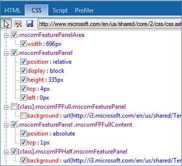 Das Stiltool zeigt alle Stilregeln an, die auf das ausgewählte Element in einer überlappenden Reihenfolge angewendet werden, wobei die aufgehobenen Stile durchgestrichen sind. Verwenden Sie das Kontrollkästchen neben jeder Regel zum Aktivieren bzw. Deaktivieren der entsprechenden Regel, und zeigen Sie dann die Auswirkung sofort in Windows Internet Explorer an. Das Tool „Formate nachverfolgen" zeigt die Berechnung einer spezifischen Stileigenschaft an. In dieser Ansicht werden Stile nach Eigenschaft anstatt nach Regel gruppiert. Dadurch ist der berechnete Wert einer Eigenschaft sofort sichtbar. Das Erweitern der Eigenschaft zeigt alle Regeln an, die diese Eigenschaft festlegen, wiederum in einer überlappenden Reihenfolge, um anzuzeigen, wie Windows Internet Explorer das Endergebnis ermittelt hat.