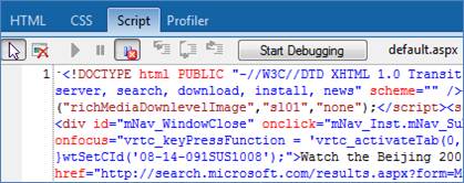 Der Skriptmodus ermöglicht Ihnen das Debuggen von Skripts auf Ihrer Webseite, indem er Ihnen ermöglicht, den Code durchzugehen, Haltepunkte einzufügen und Variable zu überprüfen. Durch Bereitstellen eines integrierten einfachen Debuggers, mit dem Sie feste Haltepunkte einfügen und eine clientseitige Skripterstellung durchlaufen können, ermöglichen die Entwicklertools das Debuggen Ihrer Skripts, ohne Windows Internet Explorer zu verlassen. Sie können auf die Registerkarte Skript im Fenster „Entwicklertools“ klicken, um auf den Skriptmodus zuzugreifen. Abbildung 9 zeigt die in der oberen linken Ecke des Fensters „Entwicklertools“ ausgewählte Registerkarte Skript.