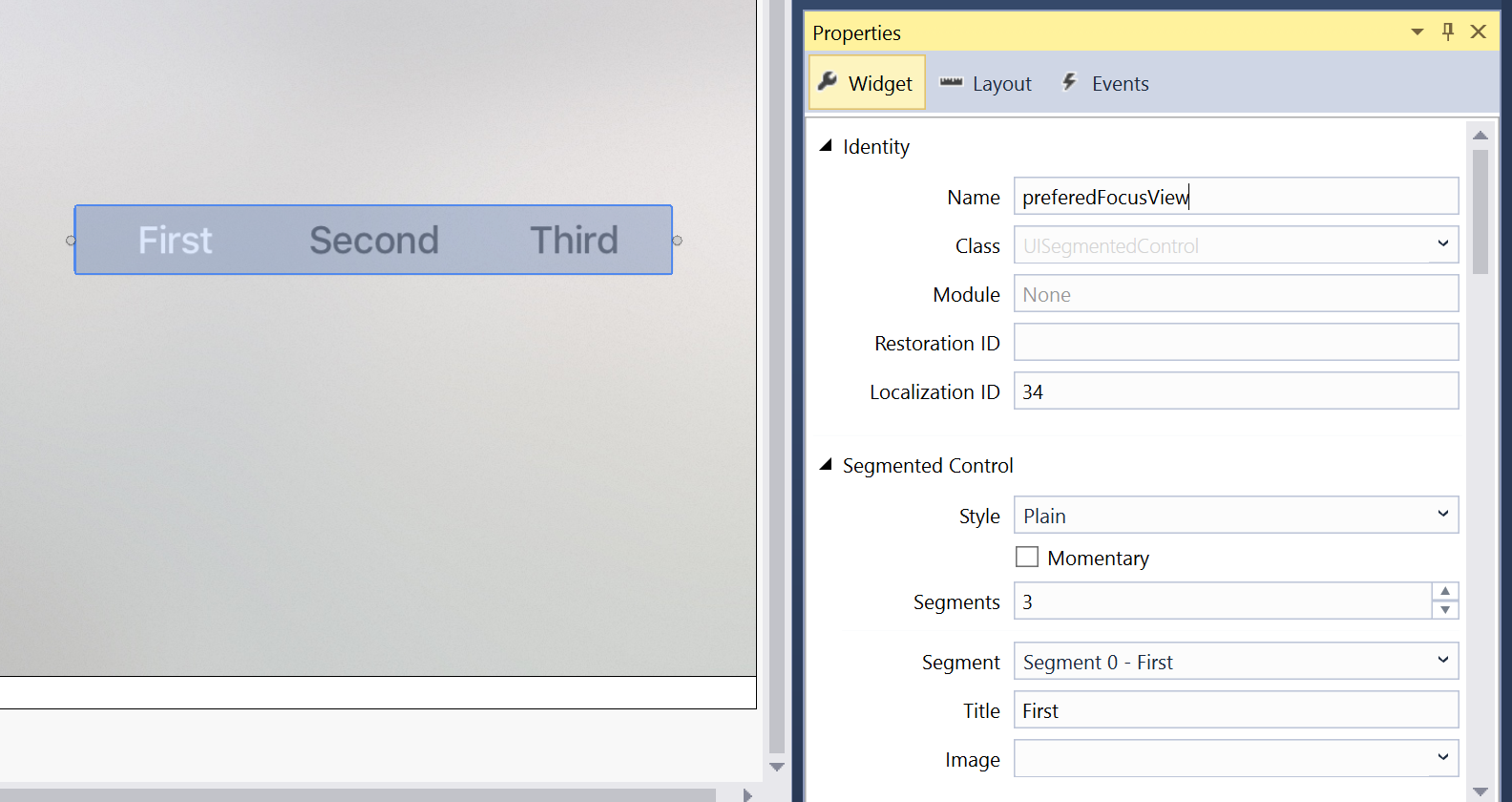 Die einfachste Möglichkeit zum Arbeiten mit Segmentsteuerelementen in einer Xamarin.tvOS-App besteht darin, sie mithilfe des iOS-Designers zur Benutzeroberfläche der App hinzuzufügen.