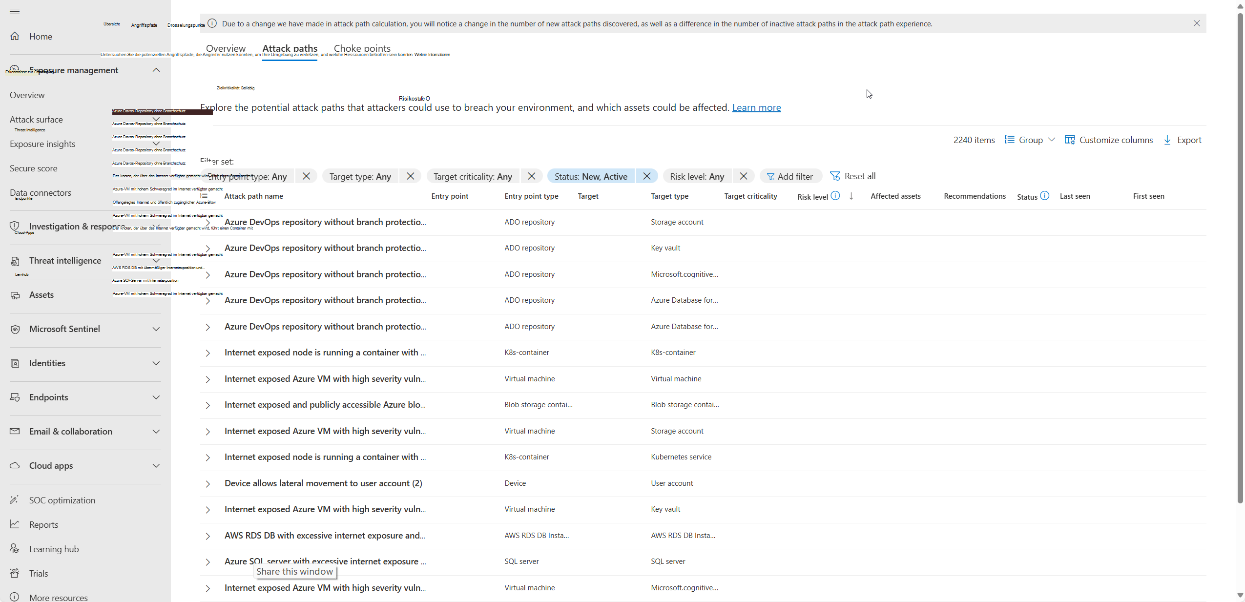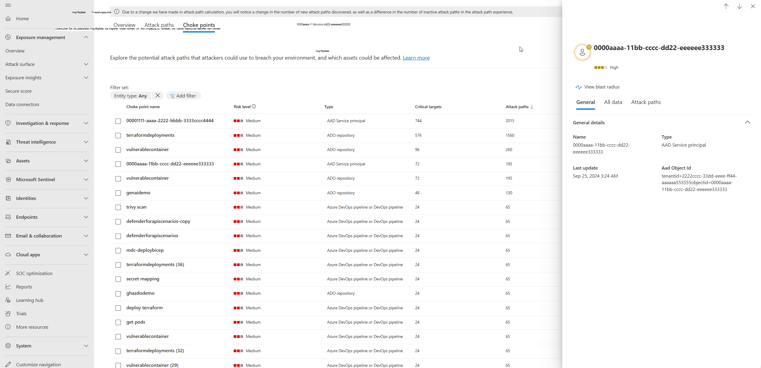 - Der Wert von Angriffspfaden steigt basierend auf den Daten, die als Quelle verwendet werden. Wenn keine Daten verfügbar sind oder die Daten nicht die Umgebung Ihres organization widerspiegeln, werden möglicherweise keine Angriffspfade angezeigt. Angriffspfade sind möglicherweise nicht vollständig repräsentativ:
