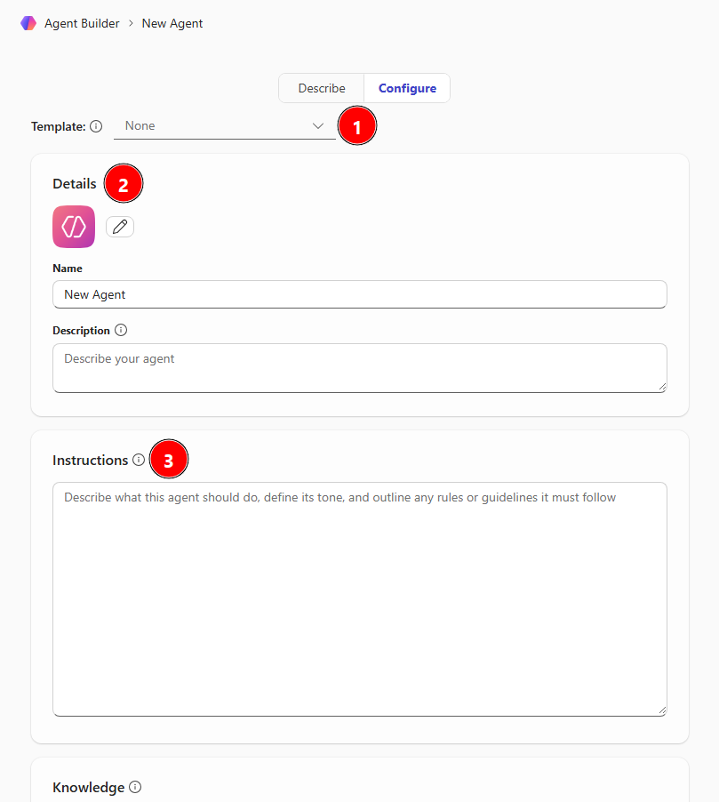 Beschreiben oder Konfigurieren – Mit dieser Umschalttaste können Sie auswählen, ob Sie den Agent auf der Registerkarte Beschreiben in natürlicher Sprache bearbeiten oder auf der Registerkarte Konfigurieren Agentdetails manuell konfigurieren möchten..