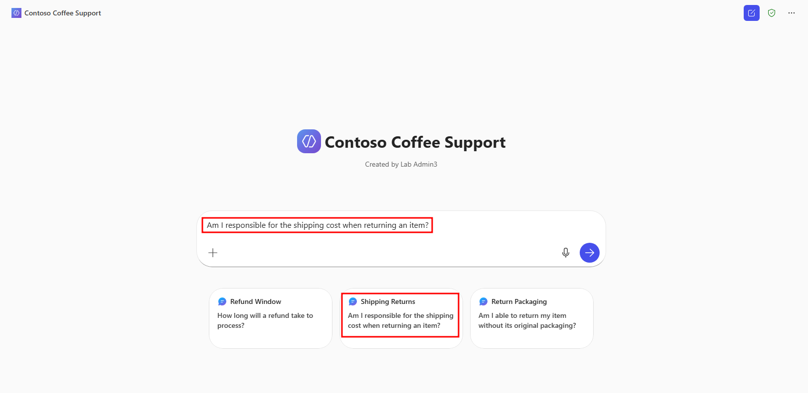 Nachdem Sie zum Contoso Coffee Support-Agenten navigiert haben, wählen Sie die Versandrückläufer vorgeschlagene Prompt aus, und wählen Sie die Schaltfläche Senden im Chatfenster mit der vorausgefüllten vorgeschlagenen Prompt.
