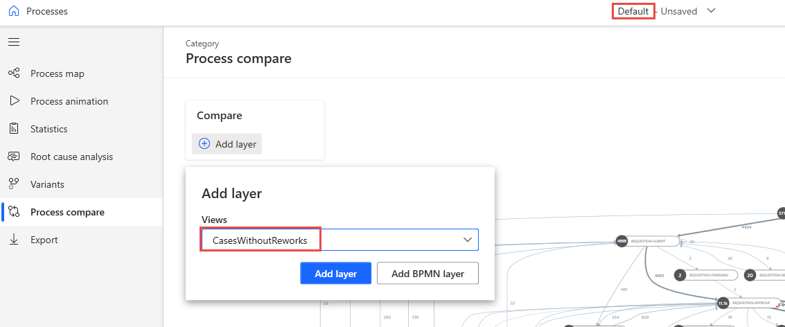 Wechseln Sie zur Ansicht zurück, die alle Fälle umfasst. Wählen Sie Prozessvergleich aus der linken Navigation aus, und fügen Sie dann die von Ihnen erstellte Ansicht als Ebene hinzu. Sie können insgesamt drei zusätzliche Ansichten auswählen, die dem Vergleich als Ebenen hinzugefügt werden sollen. Zudem können Sie Ebenen aus einer BPMN-Datei (Business Process Model and Notation) hinzufügen.