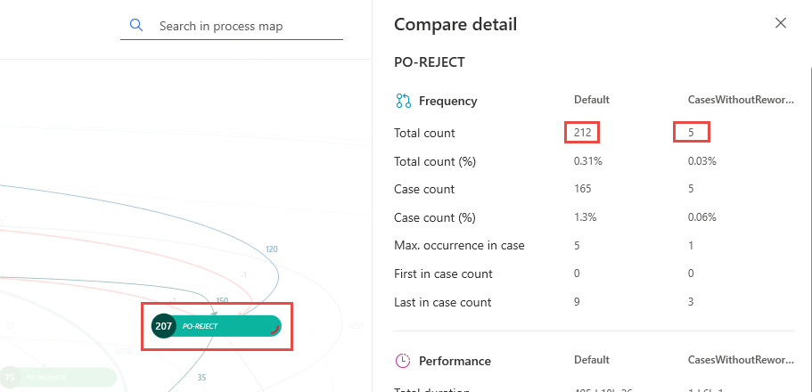 Die visuelle Darstellung verwendet die Farbe Rot, um die Pfade anzuzeigen, die für Fälle ohne Nacharbeit spezifisch sind. Zur Anzeige der Häufigkeit der Fälle ohne Nachbearbeitung können Sie den Pfad auswählen.