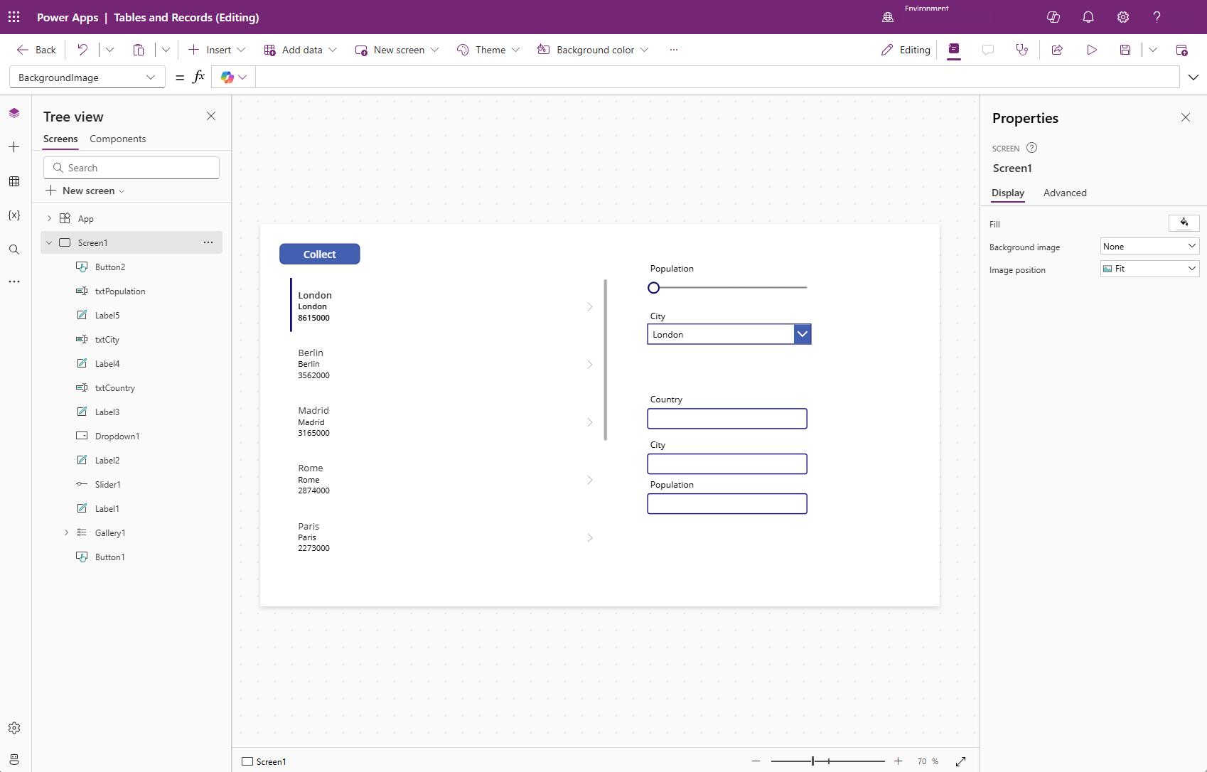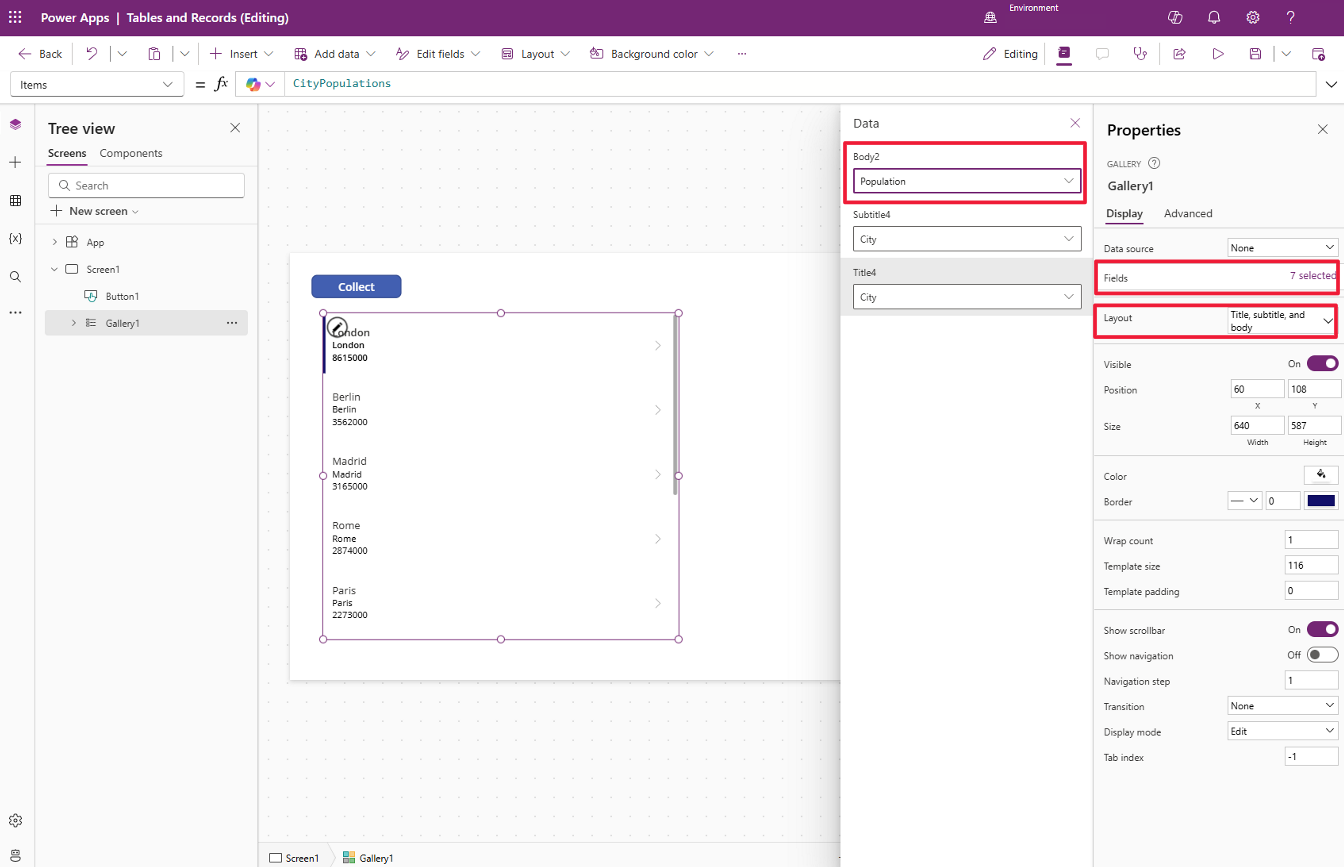ClearCollect(CityPopulations, {City:"London", Country:"United Kingdom", Population:8615000}, {City:"Berlin", Country:"Germany", Population:3562000}, {City:"Madrid", Country:"Spain", Population:3165000}, {City:"Rome", Country:"Italy", Population:2874000}, {City:"Paris", Country:"France", Population:2273000}, {City:"Hamburg", Country:"Germany", Population:1760000}, {City:"Barcelona", Country:"Spain", Population:1602000}, {City:"Munich", Country:"Germany", Population:1494000}, {City:"Milan", Country:"Italy", Population:1344000})Drücken und halten Sie die ALT-Taste, während Sie auf das Schaltfläche-Steuerelement klicken. Dadurch wird eine Sammlung mit dem Namen „CityPopulations“ erstellt und alle oben genannten Datensätze werden in der Sammlung gespeichert. Aktualisieren Sie die Eigenschaft Text der Schaltfläche auf „Collect“.