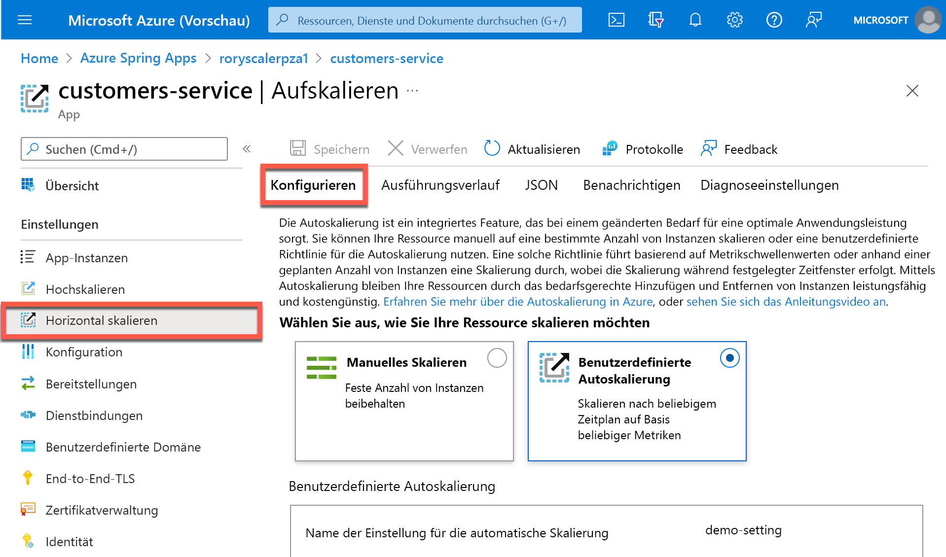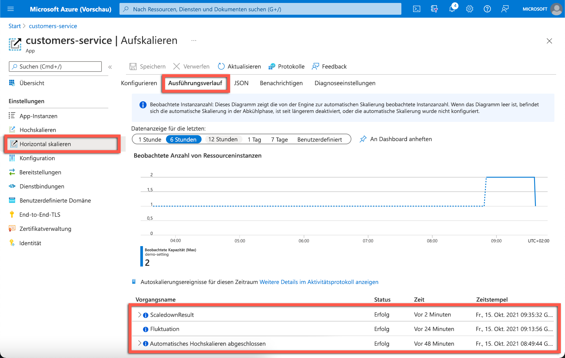 In Ihrer Azure Spring Apps-Beispielanwendung wurde bei der Erstellung eine Aktion vom Typ „horizontale Skalierung“ für den Microservice des Kundendiensts ausgelöst.