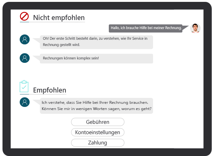 Kurze Sätze verwenden – Menschen können kurze Sätze leichter verstehen. Zudem ahmen kürzere Sätze den Flow der Live-Unterhaltung genauer nach, wie mit „Klingt großartig! Lassen Sie mich das für Sie beginnen.“