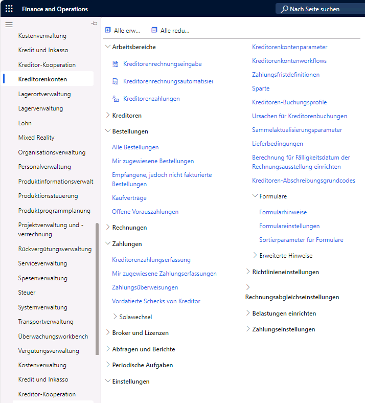 In Finanz‑ und Betriebs-Apps befindet sich die Navigationsleiste auf der linken Seite der Benutzeroberfläche. Durch Erweitern des Abschnitts Module werden alle Menüs geöffnet, auf die Sie zugreifen können. Durch Auswahl eines Moduls wird das entsprechende Menü geöffnet, wie im folgenden Screenshot dargestellt.