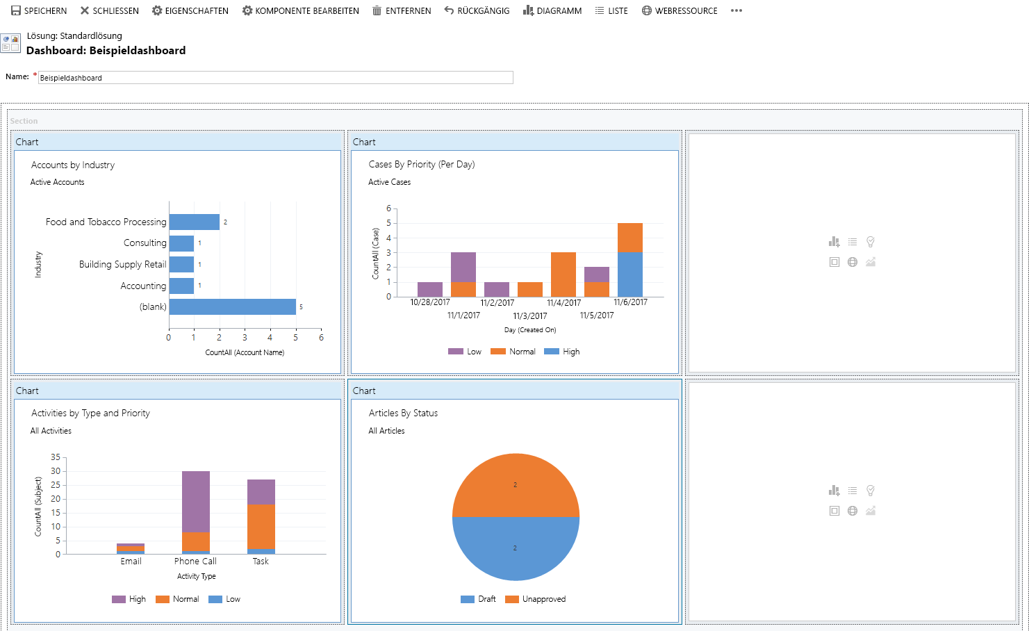 - Diagramm: Eine einzelne grafische Visualisierung (wie Leisten‑ oder Kreisdiagramm) die in einer Ansicht oder einem Formular angezeigt oder zu einem Dashboard hinzugefügt werden kann.
