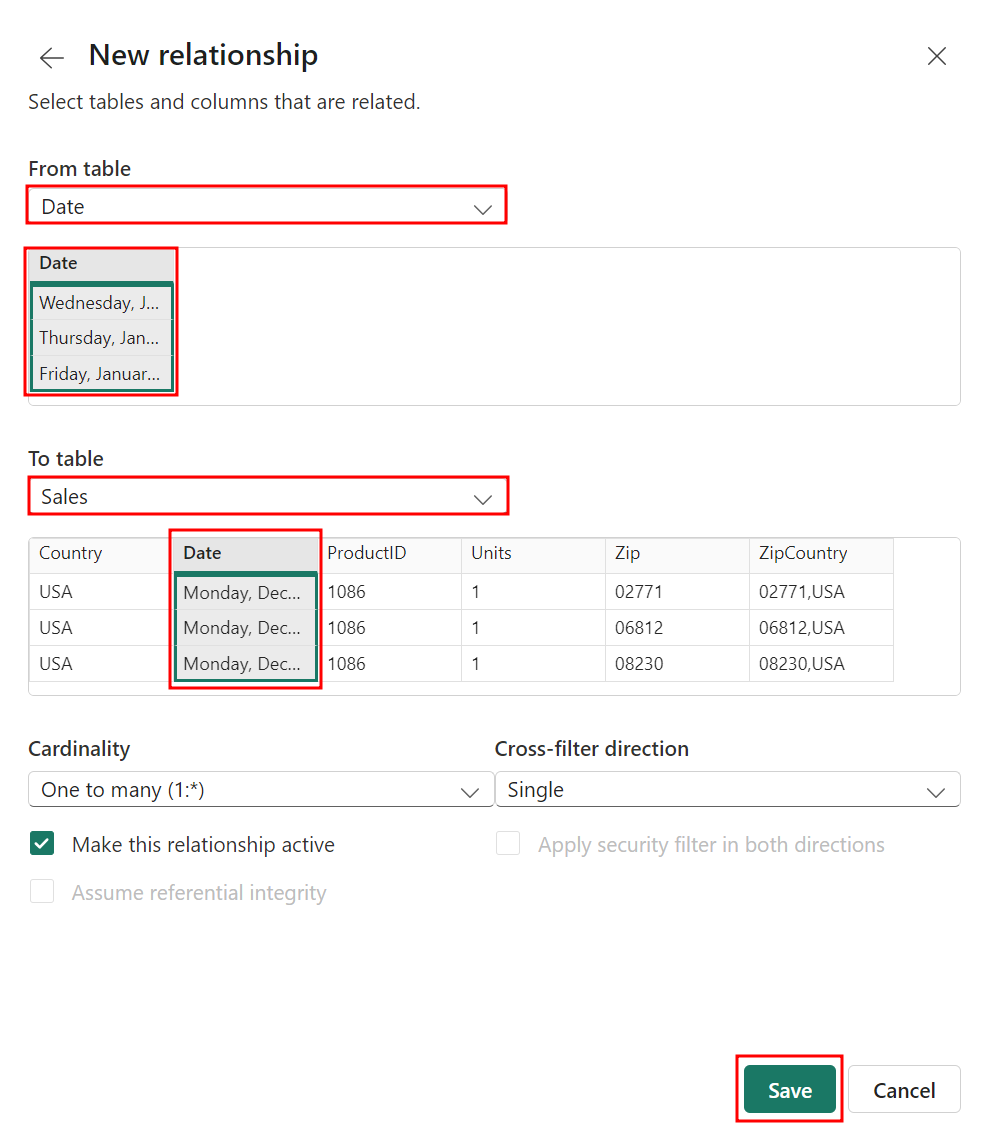 Wählen Sie dann Speichern, um das Dialogfeld Neue Beziehung zu schließen.