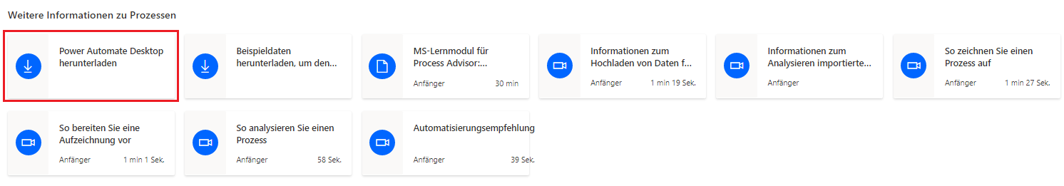 Prozess-Mining basiert auf den Funktionen und Möglichkeiten der Microsoft Power Platform, um beim Erkenntnisgewinn zu unterstützen. Microsoft Power Automate für Desktop ermöglicht Ihnen das Aufzeichnen von Aktionen, die Sie auf Ihrem Computer ausführen. Microsoft Dataverse speichert Ihre Prozess-Informationen. Daher benötigen Sie aus Lizenz‑ und Sicherheitsgesichtspunkten Zugriff auf diese Technologien, um Prozessratgeber nutzen zu können. Wenn der Prozessratgeber nicht aufgeführt ist, wechseln Sie zu Power Automate und sprechen Sie mit Ihrem Administrator über Ihre Berechtigungen.
