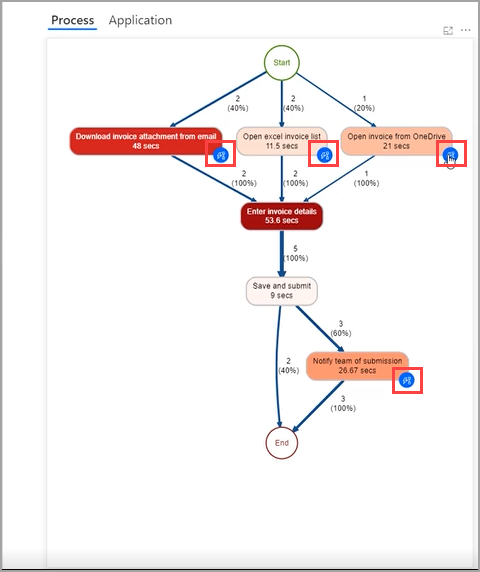In Ihrer Prozesszuordnung sehen Sie möglicherweise blaue Symbole für verschiedene Aktivitäten, wie im folgenden Screenshot gezeigt. Diese blauen Symbole sind Empfehlungen für die Automatisierung. Power Automate hat die Informationen, wie Zeit und Anwendungen, die mit dieser Aktivität verbunden sind, bewertet und weitere Maßnahmen empfohlen.