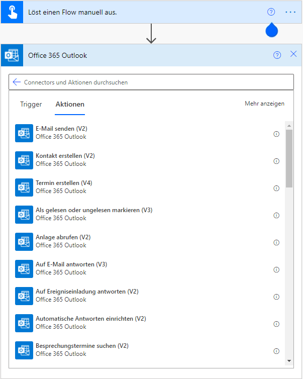 Wenn Sie ein blaues Symbol auswählen, wird ein neuer Cloud-Flow mit Vorschlägen für Konnektoren gestartet, die basierend auf Ihrem Prozess nach Aktivitäten gruppiert sind.