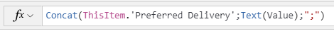 Bei Spalten für mehrere Auswahlmöglichkeiten ist die Eigenschaft des Datensatzes vom Typ „Table“. Es handelt sich um eine einspaltige Tabelle mit einer Wertspalte, wobei jede Zeile einen ausgewählten Wert darstellt. Wenn Sie eine benutzerfreundliche, durch Kommas getrennte Liste von Textwerten anzeigen möchten, ist eine gewisse Vorverarbeitung erforderlich. Wenn Sie beispielsweise über die Spalte Preferred Delivery verfügen, die Benutzern die Auswahl eines oder mehrerer Wochentage für die Lieferung ermöglicht, können Sie die folgende Formel verwenden, um die Eigenschaft Text in einer Beschriftung festzulegen.