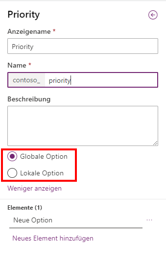 Sie können eine Liste mit verfügbaren Auswahlwerten als lokale oder globale Liste erstellen. Die Listenwerte Lokale Auswahl können nur von der Tabelle und der Spalte verwendet werden, für die sie erstellt wurden. Mit der Option Globale Auswahl kann die Liste für mehrere Spalten in der gleichen Tabelle oder in vielen verschiedenen Tabellen verwendet werden. Wenn Sie eine neue Spalte Auswahl erstellen, ist der Standardwert für die Option Mit globaler Auswahl synchronisieren?Ja (empfohlen). Mit der Option Globale Auswahl können Sie die Auswahlmöglichkeiten in anderen Tabellen verwenden. Sofern Sie sicher sind, dass die Werte nur für diese einzelne Spalte in der spezifischen Tabelle gelten, möchten Sie die Werte der globalen Auswahl verwenden.