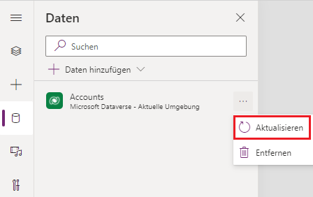 Wenn Sie Werte in einer Auswahlliste hinzufügen oder ändern, werden die neuen oder geänderten Auswahlmöglichkeiten nicht sofort im Editor angezeigt. Aktualisieren Sie die Tabelle im Datenbereich, indem Sie auf die Auslassungspunkte (...) neben der Tabelle klicken und im Popupmenü die Option Aktualisieren auswählen. Wiederholen Sie diesen Vorgang, bis Ihre neuen Werte angezeigt werden.
