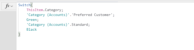 Sie können entweder systemdefinierte Werte oder eine benutzerdefinierte Werteliste für Auswahlspalten verwenden. Die Auswahlmöglichkeiten werden als Metadaten der Tabellenspalte gespeichert und können nur von einem App-Entwickler und nicht von einem App-Benutzer geändert werden. Diese Funktion ist hilfreich, wenn Sie eine App erstellen, die mit einer Werteliste arbeitet, da Ihre Formeln auf den Namen der Auswahlliste und die Anzeigenamen der Werte verweisen können. Die folgende Formel legt beispielsweise eine Farbe für die Eigenschaft Color eines Katalogelements basierend auf der Spalte Category fest, bei der es sich um eine Auswahlspalte handelt.