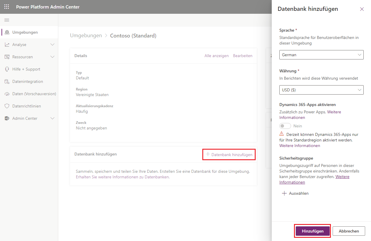 In einem Demo-Mandanten gibt es Größenbeschränkungen dahingehend, dass beim Erstellen einer Dataverse-Datenbank mindestens 1 GB Speicherplatz benötigt werden. Wenn Sie nicht über diesen Speicherplatz verfügen, können Sie keine neue Umgebung erstellen.