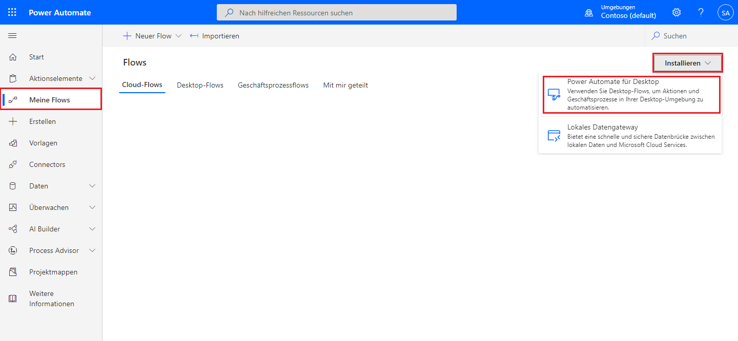 Wechseln Sie zu Power Automate, und melden Sie sich mit dem Konto an, mit dem Sie Ihre Umgebung und Datenbank erstellt haben. Wählen Sie nach dem Anmelden Meine Flows > Installieren > Power Automate für Desktop aus.