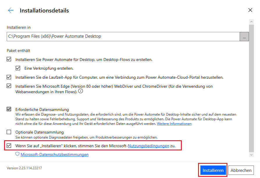 Sie müssen den Nutzungsbedingungen von Microsoft zustimmen, indem Sie das letzte Kontrollkästchen aktivieren, dann können Sie Installieren auswählen. Diese Aktion installiert das Power Automate-Paket und die Browsererweiterungen für Microsoft Edge und Google Chrome.