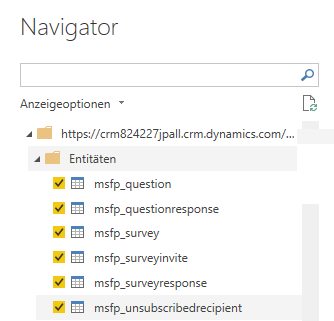 Wenn Sie mit der Umgebung verbunden sind, können die Dynamics 365 Customer Voice-Tabellen ausgewählt werden. Tabellen, denen msfp vorangestellt ist, sind Teil von Dynamics 365 Customer Voice, sodass alle Tabellen aus der Liste überprüft werden können. Zwei weitere Tabellen müssen ebenfalls ausgewählt werden: die activityparty-Tabelle und die Kontakttabelle. Nach Ihrer Auswahl werden die Daten geladen.