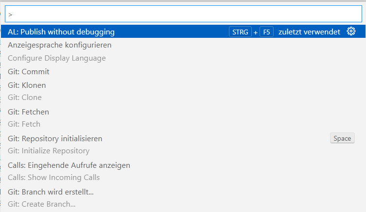 Wechseln Sie in Visual Studio Code zur Befehlspalette, und wählen Sie die Option AL: Ohne debuggen veröffentlichen aus.